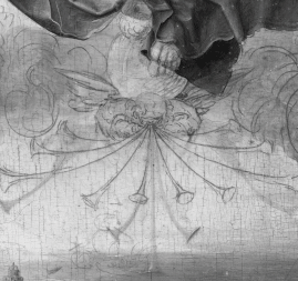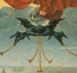 圖 4b: 相比較畫中實(shí)際所畫的5個喇叭,可以看到近紅外成像中有10個喇叭在大天使之下。畫中喇叭的位置似乎需要一個重新定位的帆船。地球儀上的腳趾的位置也與原始草圖的位置不同。圖像版權(quán)所有 by Detroit Institute of Arts。經(jīng)允許使用。