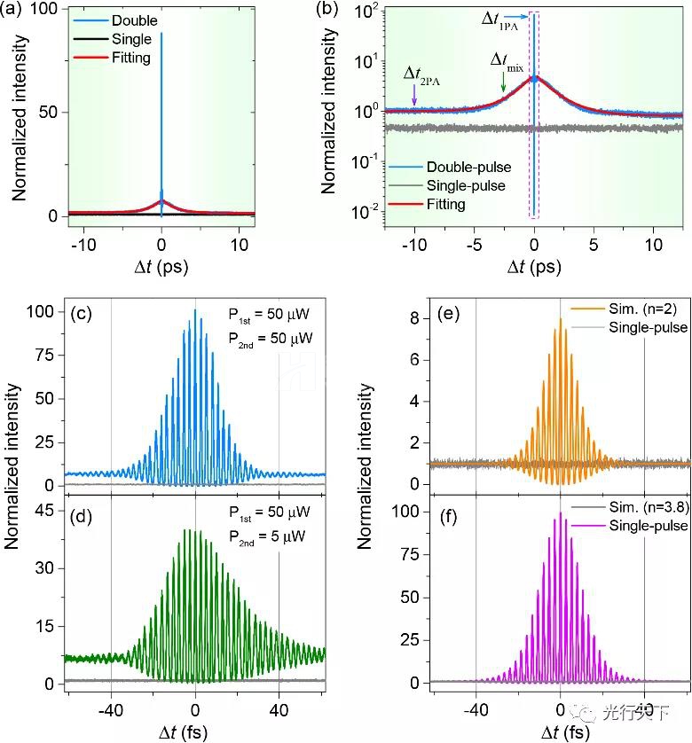 圖1 金納米粒子在不同時(shí)間尺度下的超快動(dòng)力學(xué)行為。(a)線性坐標(biāo);(b)對(duì)數(shù)坐標(biāo)。(c)兩束等功率飛秒脈沖激發(fā)下的對(duì)稱干涉條紋;(d)不等功率激發(fā)下的非對(duì)稱干涉條紋。傳統(tǒng)多光子激發(fā)效果模擬:(e) n =2,(f) n =3.8。