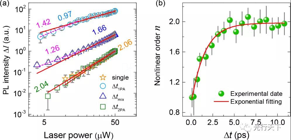 研究工作同時(shí)表明,通過精確調(diào)控兩束飛秒激光的延遲,可以精準(zhǔn)地調(diào)控飛秒激光與金納米粒子相互作用的非線性系數(shù)。如 圖2所示,使用單束飛秒脈沖激發(fā)金納米粒子時(shí),其熒光表現(xiàn)出明顯的雙光子吸收過程,非線性系數(shù)為2;在采用雙脈沖激發(fā)時(shí),當(dāng)僅改變其中一束飛秒激光功率時(shí),金納米粒子的熒光隨兩束脈沖延遲的增加呈現(xiàn)出從線性過程向雙光子過程漸變的奇異行為。在金納米粒子的實(shí)際應(yīng)用中,線性過程更適用于精密測(cè)量與傳感,而高階非線性過程對(duì)超分辨成像更有利。