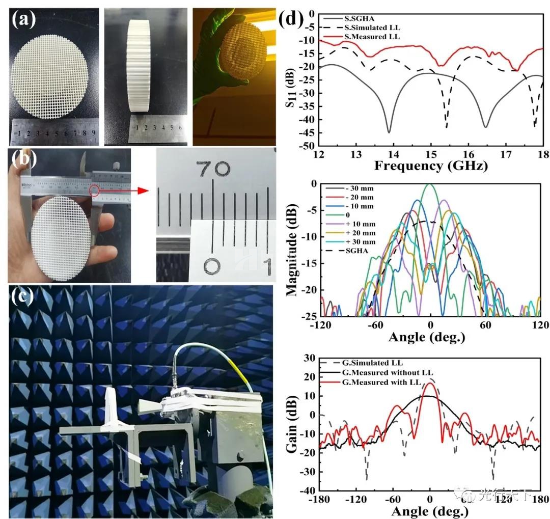 本論文通過引入超材料結構,實現(xiàn)了高介電常數(shù)陶瓷介質的梯度分布,并結合轉換光學理論,采用SLA紫外光固化3D打印工藝制備,制備獲得了一種低剖面結構的龍勃透鏡。該透鏡天線燒結溫度低(850°C燒結成型)、成型精度高(凈尺寸與設計尺寸幾乎一致)、厚度薄(約10mm),在Ku波段實現(xiàn)了±15°的波束掃描,對饋源的增益提升超過5 dBi。該工作為復雜結構微波/射頻器件一體化成型提供了新思路,有利于推進低成本陶瓷微波/射頻組件的開發(fā)與制備。