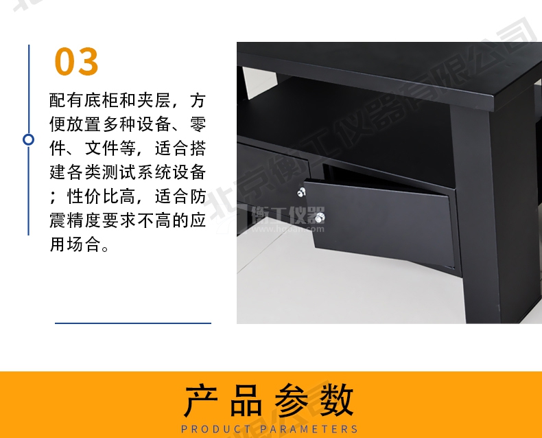 衡工儀器柜式光學隔振平臺,由上層臺面和下層支架兩部分組成,臺面采用蜂窩芯隔振面包板,m6螺紋孔支架采用鈑金折彎整體焊接技術